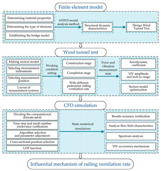 This research investigates the VIV characteristics of the Huangjuetuo Bridge, currently under construction in China, along with the impact of railing ventilation rates and the associated mechanisms. Wind tunnel tests and computational fluid dynamics (CFD) simulations are conducted to achieve these objectives. Section 2 focuses on calculating the structural dynamic characteristics of the bridge using the finite element method. In Section 3, wind tunnel tests are carried out to measure the VIV response of the sectional model under different railing ventilation rates during the completion stage and the VIV response of the construction stage cross-section. Section 4 investigates the mechanism of VIV occurrence and the influence of railing using numerical simulation. Figure 1 provides a visual representation of the technology roadmap employed in this research.