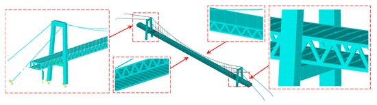 The dynamic characteristics of a suspension bridge are typically computed through the finite element method or measured using the environmental excitation method [37]. To accurately model the combined beam-slab-shell unit and to obtain consistent dynamic characteristics with the actual bridge, this research employed ANSYS APDL 15.0 software to construct a 3D finite element model based on the design drawings and documents, as shown in Figure 3. The finite element model has the same dimensions as the actual bridge. The main girder and towers were modelled using 3D elastic beam units (Beam4 units), while the main cables and booms were modelled using 3D linear rod units (Link10 units). The railings, maintenance vehicle tracking, and other ancillary components were modelled using mass units (Mass21 units) that simulate only the mass, not the stiffness [38]. Each node was assigned three degrees of freedom. Furthermore, the nonlinear solver was utilized to calculate the vibration patterns of suspension bridges and fully considered the effects of material nonlinearity and geometric nonlinearity. By accurately modeling the nonlinear behavior of the material as well as the large deformations and displacements of the structure, we were able to more accurately predict the intrinsic frequency and mode shape of the suspension bridge. An ANSYS modal analysis was utilized to solve the dynamic characteristics of the bridge, and Table 1 shows the primary vibration modes and frequencies of the suspension bridge. These dynamic characteristics will serve as actual bridge values for designing the sectional model system in the wind tunnel test.