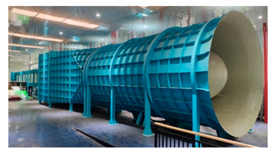 Wind tunnel testing is the most commonly employed method to investigate wind-induced vibration problems [39,40]. This research experimented at the Experimental Center of Civil Engineering, Chongqing University, in a 15.0 m (long) × 1.8 m (high) × 2.4 m (wide) DC wind tunnel, as shown in Figure 4. The test section is equipped with a special device for dynamic testing of the bridge sectional model. Tests were performed in uniform flow with equal wind speeds across all locations in the wind tunnel. Wind speeds ranging from 0.50 to 35.00 m/s were continuously adjusted, with turbulence intensity less than 0.50% of the corresponding wind speed. Moreover, the airflow deflection angle, velocity field deviation, and velocity stability were less than 1.00%. To ensure that the test conditions are similar to the actual situation and to reduce the effect of friction on the incoming flow on the test wall of the wind tunnel, the tests were conducted at the middle height of the wind tunnel. To measure the vibration response of the sectional model, aerodynamic forces, and real-time wind speed in the wind tunnel, two laser displacement sensors [41], a high-frequency force balance [42], and a TFI series 100 cobra probe [43] were employed, respectively.