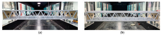 The sectional model used in this investigation was selected from the middle section of the truss girder and was constructed to a scale of 1:55, with a length of 2.2 m, as shown in Figure 5. To ensure accurate experimental results, the sectional model was designed to match the actual aerodynamic shape of the bridge [44]. A spring-suspended sectional model (SSSM) system was developed to simulate vertical and torsional vibrations precisely, as depicted in Figure 6. The sectional model was suspended from the angle-of-attack turntable using eight springs through two steel brackets, with independent vertical and torsional displacements. Additionally, the aspect ratio of the sectional model was 4.0, and the end plates were not installed according to the Chinese design specification [45]. The weight and distribution of the counterweight blocks were adjusted to achieve the required equivalent mass and mass moment of inertia. Adjusting the spring stiffness and spacing ensured the appropriate vertical and torsional vibration frequency and frequency ratio of the sectional model. Furthermore, the actual-to-experimental wind speed ratio was reduced by increasing the spring stiffness, which was 4.48 in this test. The wind speed for the force test was set to 10.0 m/s, while the wind speed for the vibration test was gradually increased from 0 to 10.0 m/s, with a wind loading range of 0.2 m/s. When VIV occurred, the wind loading range was reduced to 0.1 m/s. Table 2 shows the critical design parameters of the SSSM system.