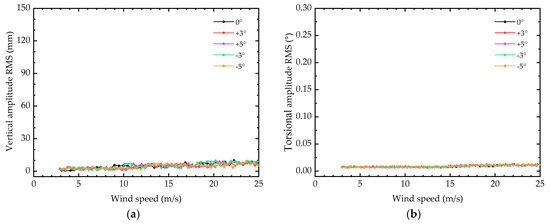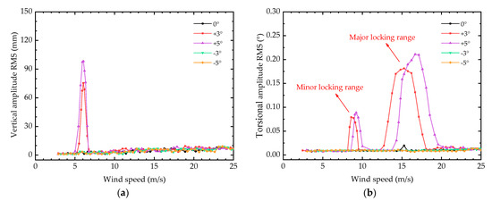 Wind tunnel tests were conducted to measure the VIV responses of the sectional model in the construction and completion states at five wind angles of attack, 0°, ±3°, and ±5°, and the results are presented in Figure 9 and Figure 10. No VIV was observed in the tests for the construction stage model, while significant VIV occurred in the completion stage model at +3° and +5°. The addition of various accessory elements such as railings, maintenance vehicle tracks, and sidewalk corbels significantly degraded the truss girder’s aerodynamic performance, resulting in significant VIV. The completion stage sectional model tests revealed two forms of VIV: vertical VIV appeared first, followed by torsional VIV. Unlike vertical VIV, which has only one locking range, torsional VIV has two locking ranges with significant differences in amplitude, named major locking range and minor locking range, respectively. With an increase in wind angle of attack from +3° to +5°, the maximum amplitude of vertical VIV and major torsional VIV increased significantly, while minor torsional VIV increased slightly. Furthermore, the length of the vertical VIV locking range and the starting wind speed did not change significantly, while the starting wind speed of the torsional VIV was significantly delayed. No obvious VIV phenomenon was observed under the three angles of attack of 0°, −3°, and −5°.