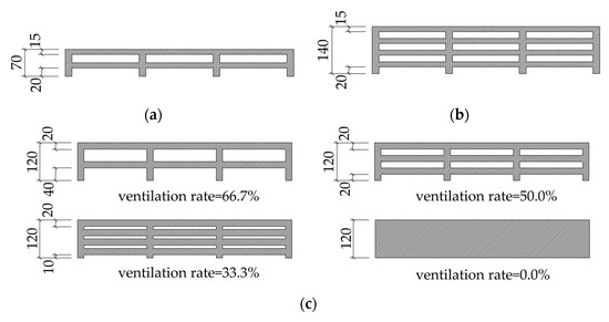 In the original section, VIV occurred only at +3° and +5° wind angles of attack. Therefore, the impact of railing ventilation rates on the VIV of the truss girder was examined at these two angles. Three types of lattice railings with ventilation rates of 66.7%, 50.0%, and 33.3%, as well as an airtight railing with a ventilation rate of 0.0%, were utilized in this research. The pedestrian ventilation rate was decreased by increasing the horizontal bars. The original bridge design of the completion stage adopted a pedestrian railing with a ventilation rate of 66.7%. The ventilation rate of the anti-collision railing and the upper deck edge railing, which had a weak impact on VIV, was not altered [47,48]. Figure 12 displays the schematic diagram of the railings utilized in this investigation.