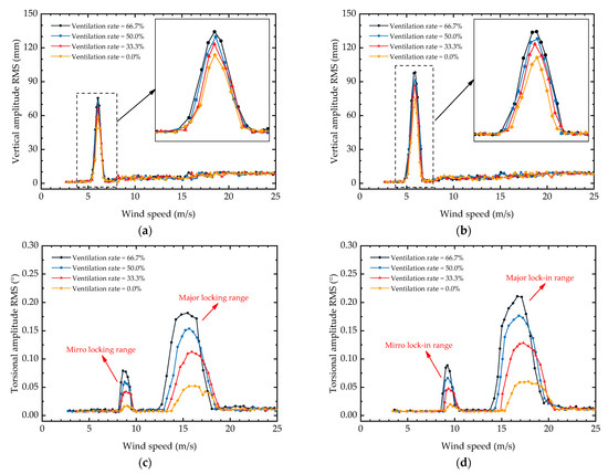 VIV responses of the truss girder with different pedestrian railing ventilation rates (converted to actual bridge values). (a) vertical responses at +3°. (b) vertical responses at +5°. (c) torsional responses at +3°. (d) torsional responses at +5°.