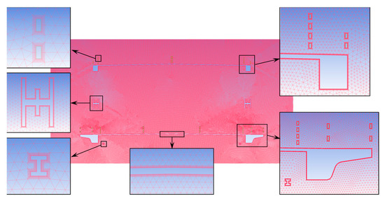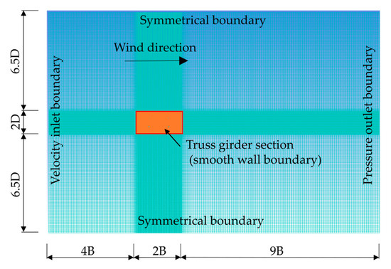 The computational domain mesh was generated using the preprocessing software ICEM 15.0, with the computational domain taking the form of an overlapping external and internal region [56]. The external region was 15B long and 15D high, with the inlet boundary being the velocity inlet located 5B from the center of the section and the outlet boundary being the pressure outlet located 10B from the center. The upper and lower boundaries were considered free-slip symmetric boundaries, positioned 7.5D from the center of the section. A structured mesh was employed, and the external region was large enough to minimize the boundary’s impact on the internal region’s flow field. The internal region was 2B long and 2D high, using an unstructured mesh. The outer wall of the truss girder section and accessory members were treated as smooth wall boundaries. Figure 14 shows the boundary conditions of the computational domain. The number of meshes significantly influenced the calculation results, with excessively sparse meshes affecting calculation accuracy and overly dense meshes significantly increasing the calculation volume and reducing calculation efficiency. This research set the maximum mesh size in the internal region to 6 × 10−3 mm. To meet the computational needs of the SST k-ω turbulence model, a boundary layer mesh was positioned at the wall surface. The boundary layer consisted of 12 layers with a linear growth rate of 1.2 for the section and accessory components, with the height of the first layer taken as 5 × 10−5 mm to ensure a smooth transition of the near-wall mesh [57]. The total number of meshes was 0.22 million, which was sufficient after the trial calculation [28,29]. Furthermore, the Y-plus values of the truss girder section were all less than one, indicating that the mesh division met the requirements of the SST k-ω model [58]. Figure 15 displays the computational domain mesh division.