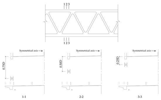 Truss girders have a continuously changing cross-section with the length direction of the bridge, resulting mainly from the web member position changes. To investigate the impact of web member position on the calculation results, three cross-sections were selected for CFD simulations, with web members located at 0.25D, 0.5D, and 0.75D from the upper chord, as shown in Figure 16. The simulations were performed using wind angles of attack of +3° and +5°, and a wind speed of 2.23 m/s (equivalent to an actual wind speed of 10.0 m/s, consistent with the wind speed used in the force tests conducted in the wind tunnel). The aerodynamic coefficients were averaged over 5 s after the calculation converged, and the results are presented in Table 5. The findings indicate that the differences between the aerodynamic coefficients of the three cross-sections are within 5%. Moreover, the web member position does not produce significant differences in the calculation results. Consequently, subsequent calculations were conducted using 2-2 cross-sections.
