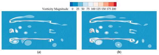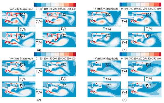 Wind tunnel tests revealed that decreasing the pedestrian railing ventilation rate suppressed the torsional VIV response of the truss girder significantly. The wind speed time-history curve recorded by measurement point P22 indicates a frequency close to the first-order torsional fundamental frequency of the truss girder, suggesting that vortex shedding in the wake region of the lower deck may dominate the torsional VIV. Reducing the railing ventilation rate may disrupt this region’s original pattern of vortex shedding. In order to investigate the mechanism behind this vibration suppression, numerical simulations were conducted on the girder cross-section using various pedestrian railing ventilation rates, and the resulting flow fields were analyzed. The simulations were conducted with a wind angle of attack of +5° and a wind speed of 16.67 m/s (equivalent to an actual wind speed of 16.67 m/s, consistent with the major torsional VIV peak response point wind speed in the wind tunnel tests). This working condition produced the most significant torsional VIV in the wind tunnel tests. Figure 20 displays the variation in vorticity contours in the wake region of the lower deck in a complete vortex shedding cycle.