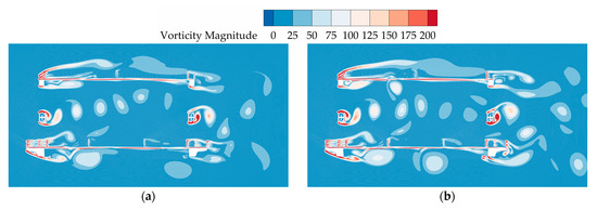 Vorticity contour of construction stage at a certain moment. (a) α = +3°. (b) α = +5°.