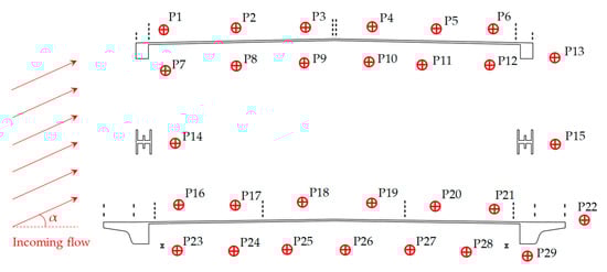 In order to find these vortices that cause VIV in the truss girder, 29 measurement points were positioned at various locations close to the girder to record wind speed time-history curves. The placement of the measurement points is depicted in Figure 19. Specifically, measurement points P1–P13 were situated around the upper deck plate, while P14 and P15 were positioned behind the windward and leeward diagonal bracing members, respectively. Measurement points P16–P29 encircled the lower deck, with P23 and P29 behind the maintenance track. Table 7 presents the characteristic frequencies of wind speed time-history curves recorded at measurement points and their corresponding Strouhal numbers.