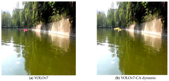 Figure 10 compares the P–R curves for the upgraded network model’s identification of tiny objects floating on the water’s surface. The AP value of the water bottle is shown by the size of the region that the P–R curve and coordinate axis enclose. After numerous learners learn the data, if P–R Curve A of one of the learners completely envelops the P–R curve of another learner, B, it can be asserted that the performance of A is better than that of B. From the figure, it can be clearly seen that the P–R curve of the improved YOLOv7 network model in the detection of the small target dataset has completely enveloped the P–R curve of the baseline model. Therefore, the performance of the new model proposed in this paper was higher than the benchmark model in small target detection.