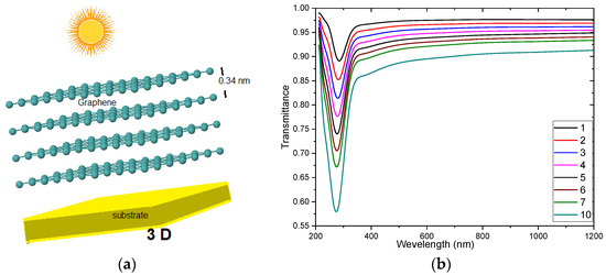 This paper studies the use of graphene as a transparent conductive oxide on the front layer of the solar cell. To assess the impact of the proposal on the performance of the cell, the optical properties resulting from considering different graphene layers (from one to ten layers) are modelled. The optical properties calculated for graphene are refractive index , reflectance , and absorbance . The thickness of each layer of graphene is [42]. Figure 2a shows the diagram of graphene layers on the substrate. Figure 2b shows the spectral transmittance, , of the considered graphene layers, and the values are obtained from refractiveindex.info database [43].