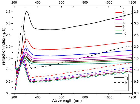 Solid lines show the refraction index Dashed lines show the extinction coefficient . Color lines show the number of layers.