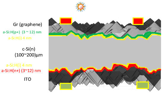 Graphene has shown an interesting potential as a transparent conductor in several optoelectronic devices, such as LED, solar cells, touch screens, and so on [13,14]. Danietti et al. [15] studied the incorporation of graphene as a transparent conductive layer in organic cells. For this purpose, they also included a Niquel grid below the graphene layer to enhance electrical conductivity. With this configuration, the efficiency of the organic cell was 4.2%, which was lower compared to the use of ITO (6.1%) due to a higher sheet resistance. Graphene has also been studied for ITO and AZO replacement in HIT cells due to its high transparency (97% for the monolayer) [16,17]; for its sheet resistance, which is as low as [6]; and for its carrier mobility, which is over [18,19,20]. Lancellotti et al. [21] characterized the sheet resistance, varying the number of graphene layers between one and five, and with only four and five layers, they achieved AZO conductivity properties. Thus, they tested the HIT cells with four and five graphene layers instead of AZO as the transparent conductive layer. With both numbers of layers, they obtained similar results, with efficiencies between 8.6% and 9.95%, while the efficiency with AZO was 15.21%. Torres et al. [22] were able to increase the efficiency of a HIT cell by including a graphene monolayer on top of the ITO film of the cell. However, the addition of more layers decreased optical transmittance, and it resulted in a poorer performance compared to bare ITO.