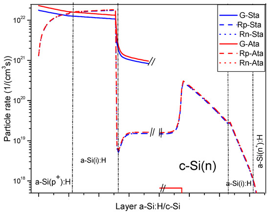 The optical model used in this work is from Lambert-Beer, where the generation of carriers is calculated by integrating the radiation flux , by , , and in the wavelength [46], and Figure 6 shows that the generation of carriers with the AM1.5 standard spectrum is lower compared to the generation rate modeled with the Atacama spectrum. In Figure 6, it can also be seen that the carrier recombination rate does not depend on . The direct dependence of the generation of carriers with the radiation flux makes the HIT heterojunction solar cell have a better energy conversion performance in places such as the Atacama Desert.