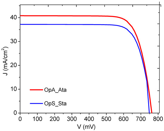 With these parameters, the electrical properties are obtained by calculating the current density curve as a function of voltage under the standard AM1.5 () and under the Atacama Desert () spectra (Figure 7). Table 5 shows the main characteristics of the solar cell under each spectrum.