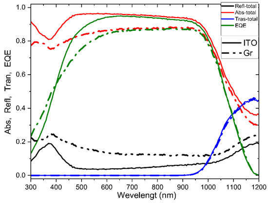 The optical properties of the HIT solar cell and its external quantum efficiency are calculated using the cell’s parameters as shown in Table 5. Figure 8 shows the absorbance spectrum (Abs) in red, the reflectance (Refl) spectrum of the front side in black, the transmittance (Tras) spectrum in blue, and the external quantum efficiency (EQE) in green. The solid lines are the values calculated when the transparent conductive layer is ITO, while the dashed lines correspond to one graphene layer as a transparent conductive layer. The cell with graphene as TCO has a larger reflectance in the 300–1200 nm wavelength range, so the cell’s absorbance is lower. Transmittance is the same in the whole range, regardless of which transparent electrode is being analyzed. Regarding the EQE in the ultraviolet range, the values calculated with graphene are higher than the values calculated with ITO, and in the visible range, the values calculated with ITO are higher than the values calculated with graphene. In the infrared range, they have the same value.
