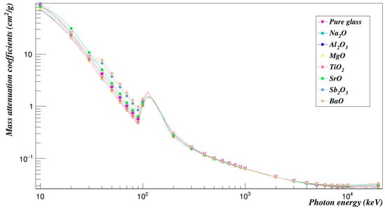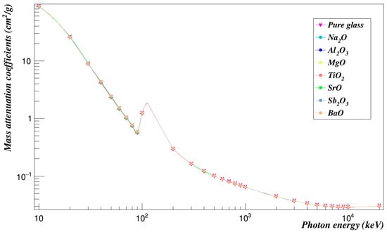 Na2O is one of the most commonly used materials in medical applications, when added to glass it decreases the crystallization rates, lowers the melting temperatures, and enhances the performance in the glass-forming zone []. Table 1 summarizes the mass attenuation coefficients of the studied glass with different fractions of Na2O at a wide photon energy range from 10 keV to 20 MeV. On the other hand, Table 2 summarizes the neutron effective removal cross sections of the studied glass with different fractions of Na2O. It can be seen that the photon-shielding capabilities of glass have decreased with the addition of the Na2O modifier while the neutron-shielding capabilities are enhanced.