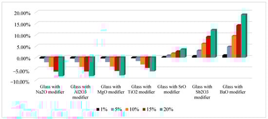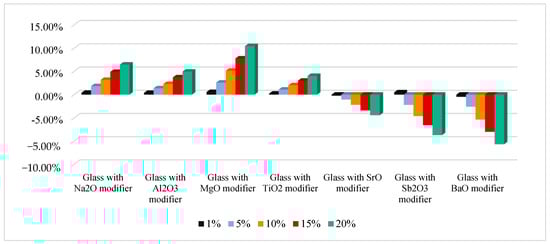 As can be seen from Figure 5 and Figure 6, the results show that BaO enhances the photon-shielding properties of ZnO-Bi2O3-B2O3-SiO2 the most among all compared metal oxides with an average between 0.95% and 18.94%, but on the other hand it decreases the neutron-shielding by an average ranging from −0.49% to −10.71%. The Sb2O3 performed nearly the same with average percentage differences between 0.61% and 12.16% for photon-shielding abilities and between −0.61% and −8.74% for neutron-shielding abilities. The SrO also increased the ability of glass to shield against photons and reduced its ability against neutrons. The MgO modifier, on the one hand, enhanced the neuron-shielding capabilities of the studied glass the most with average percentage differences ranging from 0.56% to 10.43%, while it decreased the photon-shielding properties by, on average, between −0.39% to −7.89%. The Na2O, Al2O3, and TiO2 increased the ability of the studied glass to shield against neutrons as well and reduced the ability to shield against photons. In general, the effects of modifiers on photon shielding-properties are higher than on neutron-shielding properties. From a practical point of view, the neutron activation of elements and the formation of point defects must be considered when choosing the best modifier and this can be evaluated experimentally, as some studies have reported [,,].