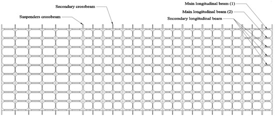 The bridge under study is in Guizhou Province, China, and spans a total length of 381.5 m. It has a main span measuring 280 m and a deck width of 38.9 m. The upper portion of the main bridge is composed of a steel-reinforced concrete truss arch section with a clear span of 260 m, as depicted in Figure 1. The bridge deck is constructed using a composite beam structure comprised of steel crossbeams and concrete overlays. The plan view of the crossbeams is depicted in Figure 2.