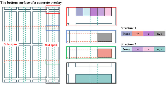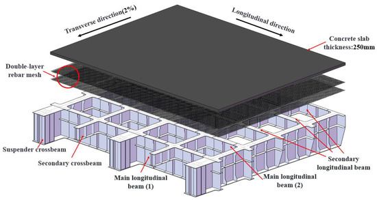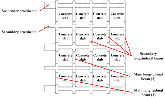 A finite element (FE) model is established using the crossbeams of the bridge deck system and the concrete overlays. The model incorporates symmetry simplifications. For the transverse direction, the FE model represents half of the total transverse span of the bridge, while for the longitudinal direction, it corresponds to the length between the transverse beams of the three suspension rods, as shown in Figure 3.