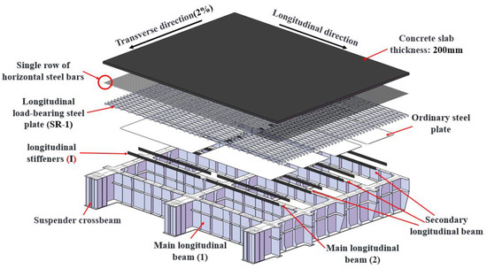 The steel–concrete composite bridge deck system fully utilizes the tensile strength of steel and the compressive strength of concrete [1,2]. It has been widely adopted in the design and construction of various large-span bridges due to its high structural stiffness, lightweight properties, and reduced deflection [3,4,5,6]. Over the past several decades, researchers have conducted theoretical and experimental studies [7,8,9,10] to verify the excellent performance of the steel–concrete composite bridge deck system during the service life of bridge structures. Among various types of steel–concrete composite bridge deck systems, the orthotropic steel deck (OSD)–concrete structure has been extensively utilized in medium and large-span bridges due to its advantages such as lightweight design, high load-carrying capacity, and fast construction speed [11].