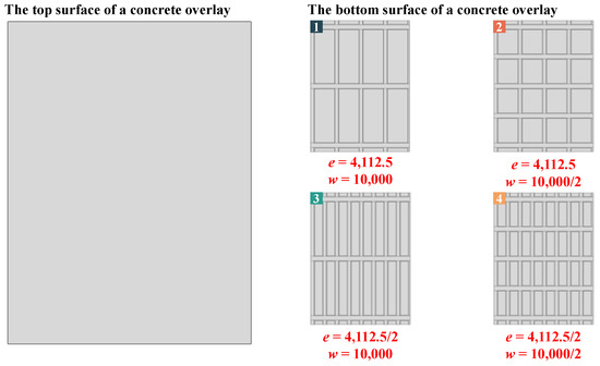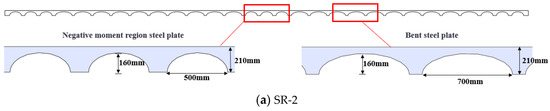When discussing the single U-rib size parameters, the spacing size parameters, and , were set as 4112.5 mm and 10,000 mm, respectively. This setting aims to achieve compatibility between the bottom side of the BUSP and the crossbeams.