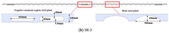 Figure 5 illustrates the improved configuration, showcasing the absence of secondary crossbeams and the inclusion of the steel plate. On the other hand, Figure 6 depicts the design of the improved PBL shear connectors.