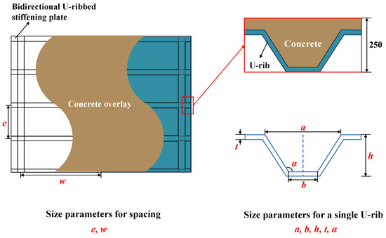 In the U-ribbed stiffening plate, the size parameters include both individual U-rib characteristics and various spacing parameters between U-ribs. The size parameters of a single U-rib consist of the following: the height of the U-rib (), the opening width of the U-rib (), the bottom width of the U-rib (), the thickness of the steel plate (), and the angle between the side and bottom edges of the U-rib (). On the other hand, the spacing parameters between U-ribs comprise the spacing between longitudinal U-ribs along the transverse direction of the bridge () and the longitudinal spacing between transverse U-ribs (). The meaning of these size parameters is shown in Table 4. And all these size parameters used in the FEA models are illustrated in Figure 10 for reference.