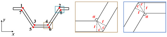 Once all the size parameters are determined, the coordinates of each node on the BUSP can be calculated using geometric methods. A Python script was developed for ABAQUS to facilitate the process of parametric modeling. In this script program, the nodes of the U-rib are assigned numerical labels, as shown in Figure 11, with Node 1 serving as the origin of the coordinate system. In the case that the nodes of the U-rib have been processed according to Figure 11, the coordinates of all the U-rib nodes can be expressed as a function of the size parameters. Table 5 presents the x-coordinates (abscissa) and y-coordinates (ordinate) for the eight nodes of the U-rib, in which is calculated according to the following formula.