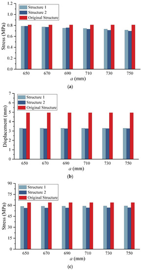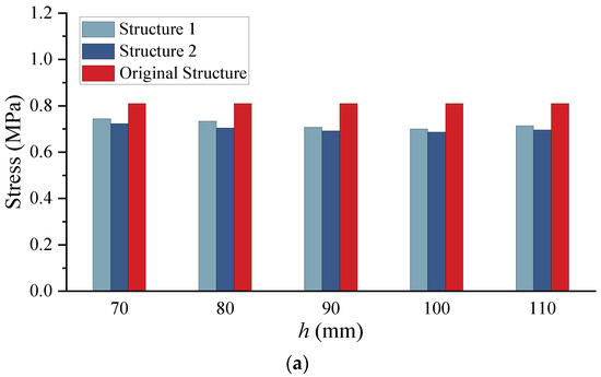 Figure 12 demonstrates that variations in have a more pronounced effect on the bending stiffness of the U-rib compared to changes in and . Increasing effectively increases the bending stiffness of the BUSP. However, it is important to note that an increase in does not necessarily result in smaller concrete stresses. Figure 13 provides information on the maximum stress and displacement of the concrete overlay in Structure 1, Structure 2, and the original structure for different values of (70, 80, 90, 100, and 110 mm). Additionally, Figure 13c compares the stress of the steel crossbeams in Structure 1 and Structure 2 with that of the original structure.