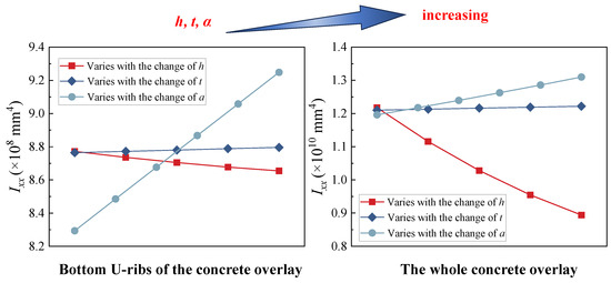 In Figure 16, it is evident that increasing the value of leads to a significantly greater increase in the stiffness of the concrete components compared to the other two parameters ( and ). Additionally, as the value of increases, the flexural stiffness of the concrete component decreases, which explains why the maximum tensile stress in the concrete increases when the value is raised from 100 mm to 110 mm. The decrease in the stiffness of the concrete overlay with an increasing value mainly results from the reduction in the thickness of the concrete overlay outside the U-ribs.