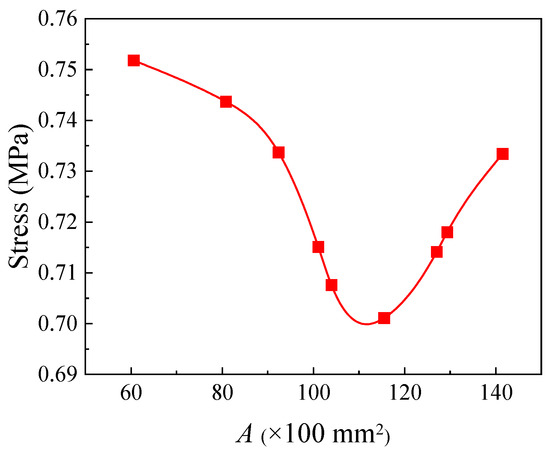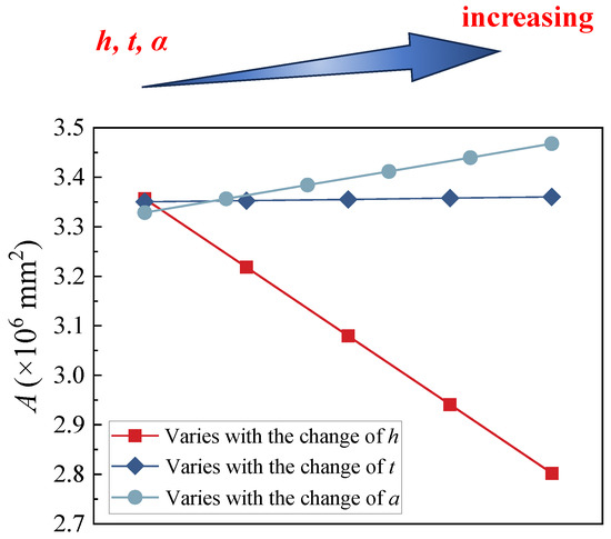 Based on the analysis of Figure 10 and Figure 11, it is evident that the independent size parameters for a single U-rib include , , , and . However, to ensure compatibility between the BUSP and crossbeams, this study considers as a constant value. Consequently, the dimensional parameters under investigation are , , and . To explore the combined effects of these dimensional parameters on the stress of the concrete overlays, this study introduces the area parameter for a single U-rib. This parameter, expressed by Equation (2) using the values of , , , and , plays a vital role in the analysis.