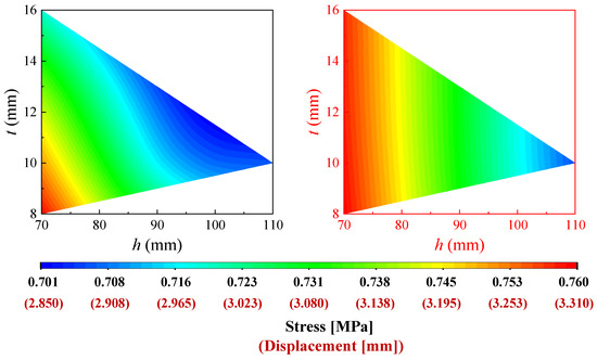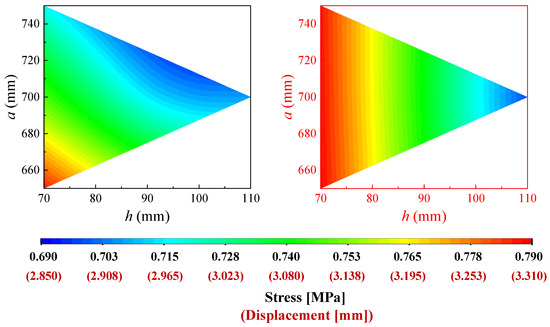 Similar to the simultaneous variation of and , Figure 20 illustrates the changes in stress and displacement of the concrete overlay with variations in and . Comparing Figure 20 with Figure 19 reveals that while an increase in , , and leads to a decrease in the stress of the concrete overlay (when is below 100 mm), their individual impacts on concrete stress differ. When comparing the variations with , the direction in which the stress decreases most rapidly, as depicted in Figure 19, is closer to the -axis, whereas in Figure 20, it is closer to the -axis. This indicates that variations in have a slightly smaller effect on the stress of the concrete overlay compared to variations in , while variations in have a slightly greater effect.