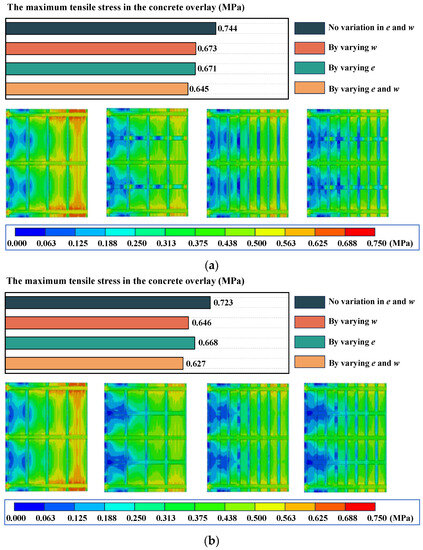 In Figure 22, the variation of the maximum tensile stress in the concrete overlays with respect to is depicted. Notably, as the value of increases, the maximum tensile stress in the concrete overlays initially decreases, reaching a minimum at approximately , before subsequently increasing.