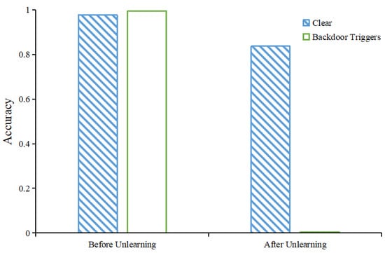 We trained a fully connected neural network model with three layers using the MNIST dataset with a backdoor trigger that tricks the model into classifying the number “1” as the number “9”. Our fully connected network consists of three layers, and the number of neurons is 784 × 100, 100 × 100, and 100 × 10, respectively. In addition, there are ReLu activation functions between every two layers. We evaluated the unlearning effect of our first unlearning method. We show the clean prediction accuracy and the backdoor prediction accuracy of the model before and after unlearning, respectively, as shown in Figure 2. The figure shows that the prediction accuracy of the model for clean data changes from 97.66% to 84.67%, while the success rate of backdoor attacks decreases from 99.47% to 0.18%. This shows that our approach can completely remove backdoor triggers from the model with only a small degradation in model performance. Model performance can be recovered after a small number of epochs of knowledge distillation []. Specifically, we used the old model as a teacher to train the unlearned model.