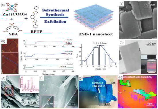 (a) The fabrication process of ZSB-1 nanosheets. (b) AFM analysis of exfoliated ZSB-1 nanosheet and corresponding height contours. (c) SEM image of an exfoliated ZSB-1 nanosheet. (d) TEM image of an exfoliated ZSB-1 nanosheet. Reproduced with permission [106]. Copyright 2018, Wiley-VCH. (e) SEM image of vdW MOF-2 sheets exhibiting a thickness of 10 nm and lower. (f) SEM image of large lateral single-crystal sizes. (g) Tape exfoliation process. (h) Exfoliated flakes on Si/SiO2. Reproduced with permission [107]. Copyright 2018, Wiley-VCH.