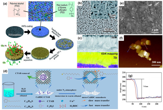 (a) Schematic representation of the PAN-HNTs-ZIF-L film preparation process. (b) SEM image showcasing the top-surface morphology of the PAN-HNTs-ZIF-L film. (c) SEM image complemented by Energy Dispersive Spectrometry mapping, providing elemental analysis of the cross-sectional region of the PAN–HNTs–ZIF-L film. Adapted with permission from [112]. Copyright 2019, Royal Society of Chemistry. (d) A step-by-step diagram of the synthesis procedures resulting in meso-CuBDC nanosheets. (e,f) Detailed SEM and AFM images revealing the structural properties of meso-CuBDC nanosheets. (g) Histogram illustrating the thickness distribution of the meso-CuBDC nanosheets. Adapted with permission from [113]. Copyright 2020, Elsevier.