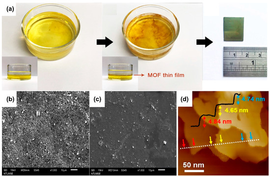 (a) Ag3BHT2 thin slice formed via liquid–liquid interfacial approach. (b) Thin slice Ag3BHT2 SEM image. (c) Thin slice Au3BHT2 SEM image. Reproduced with permission [115] Copyright 2018, American Chemical Society. (d) Ni-MOF nanosheets-6 AFM image and the corresponding height profiles. Reproduced with permission [116]. Copyright 2021, Wiley-VCH.