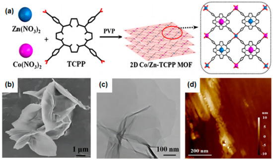 Zheng et al. [119] fabricated bimetallic 2D Co/Zn-porphyrin MOF nanomaterials using a surfactant-assisted method (Figure 5a). SEM and TEM images (Figure 5b,c) depict that Co/Zn-porphyrin displayed wrinkled nanofilm structures. Introducing PVP to Co/Zn with different molar ratios limited the vertical expansion of MOFs and promoted the 2D growth of MOFs, resulting in bimetallic 2D MOF nanomaterials with thicknesses of 4–5 nm (Figure 5d).
