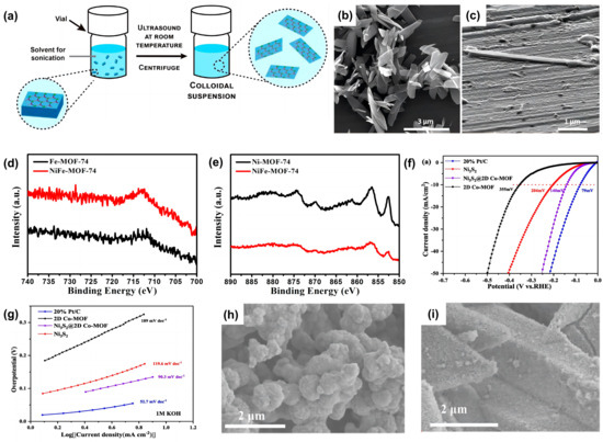 2D MOFs possess highly desirable pore structures with large specific surface areas and controllable morphologies. For example, Daniel Ruiz-Molina et al. [132] successfully prepared thin nanosheets of [Cu(2,5-pydc)(H2O)]n·2H2O (pydc = 2,5-pyridinedicarboxylic acid) using ultrasonic exfoliation (Figure 8a), resulting in highly uniform nanosheets with a thickness of approximately 126 nm (Figure 8b,c). Remarkably, the electrocatalytic performance of these nanosheets was significantly enhanced compared to that of the bulk sample, with an overpotential reduced from 530 mV to 340 mV. The improved performance of 2D MOF nanosheets can be attributed to their enhanced electron transfer between the current collector and catalytic sites, which is facilitated by the large surface area and efficient transport pathways in these materials. Using multiple metals in MOF preparation not only optimizes the electronic structure and increases the electrical conductivity but also improves electron transfer and electrocatalytic activity. Cui et al. [156] employed a one-step solvothermal method to prepare NiFe-MOF-74, which exhibited excellent electrocatalytic activity for OER. The hybridized NiFe-MOF-74 showed a network of interconnected honeycomb-like sheets, in contrast to the flower morphology of monometallic Fe-MOF-74 and the spherical shape of Ni-MOF-74 with a diameter of 3–5 µm. This structure provided a large specific surface area, exposure of more metal sites, and facilitated mass transport during the catalytic reaction, driving a current density of −10 mA cm−2 requiring only 195 mV overpotential in 1.0 M alkaline solution. As demonstrated in Figure 8d,e, X-ray photoelectron spectroscopy (XPS) images revealed a slightly negative shift of 0.2 eV in the binding energy of Ni 2p 3/2 in NiFe-MOF-74 and a positive shift of 0.8 eV in the binding energy of Fe 2p 3/2 in NiFe-MOF-74, indicating that the transfer of electrons from Fe to Ni improved the catalytic activity of the catalyst.