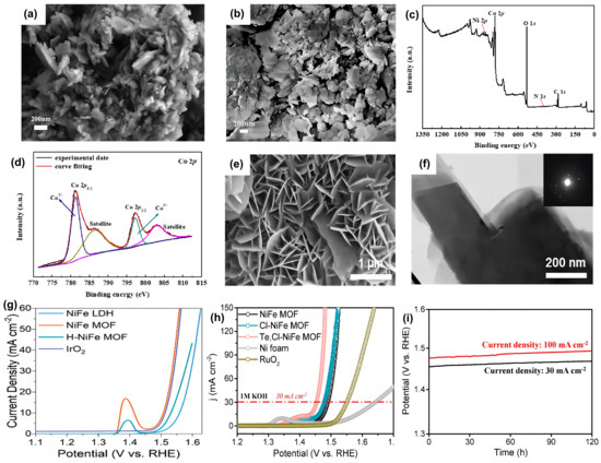 - Chen, C.; Suo, N.; Han, X.; He, X.; Dou, Z.; Lin, Z.; Cui, L. Tuning the morphology and electron structure of metal-organic framework-74 as bifunctional electrocatalyst for OER and HER using bimetallic collaboration strategy. J. Alloys Compd. 2021, 865, 158795. [Google Scholar] [CrossRef]