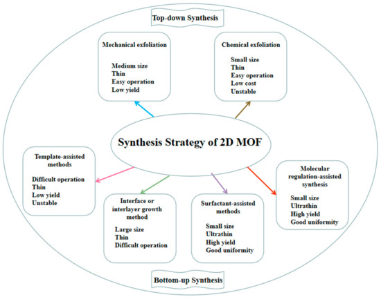 A conceptual representation of the synthesis strategies employed for fabricating 2D MOF materials.