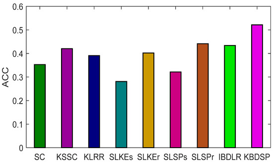 - IBDLR and KBDSP enable the learning desired affinity matrix with an optimal block diagonal structure by importing block diagonal representation term. From Table 3, it can be seen that KBDSP and IBDLR have better performance than other algorithms except SLSPs on all datasets, which verifies that KBDSP and IBDLR methods with block diagonal representation term are effective. This indicates that the KBDSP and IBDLR are beneficial for datasets that have many classes, and that they can capture the block diagonal structure of data. For COIL20 and BA datasets, which have a greater number of instances, Table 3 shows that our KBDSP achieves nearly 13% higher than other compared methods apart from IBDLR on the COIL20 dataset. In addition, as can be seen in Table 3, we can observe that KBDSP outperforms IBDLR on the COIL20 dataset; this is because our method considers the similarity-preserving strategy, but the IBDLR method does not.