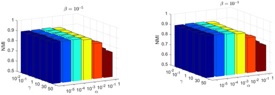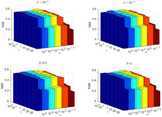 There are three parameters in the proposed KBDSP, i.e., and γ. The parameter is used to balance the similarity-preserving term , parameter β is used to control the term , and parameter γ is used to control the block diagonal representation term . The Yale and JAFFE datasets are selected for the evaluation of KBDSP. As shown in Figure 4 and Figure 5, the NMI versus different values of parameters and γ are shown. Parameters and γ take values in set , , and , respectively. From Figure 4 and Figure 5, it can be seen that KBDSP performs well for a wide range of and γ on the two datasets, and KBDSP is not very sensitive to these parameters. Moreover, when parameters and γ are set to 0.01, 0.001, and 0.1, respectively, the clustering performance of KBDSP is better than other comparison methods. Therefore, we fix , and γ = 0.1 for KBDSP in all experiments of this paper.
