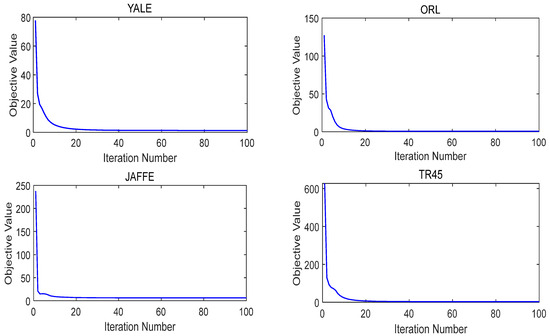 Nine corresponding benchmark datasets are used in our experiments, including five face image datasets (YALE, http://www.cvc.yale.edu/projects/yalefaces/yalefaces.html, accessed on 16 May 2012; JAFFE, http://www.kasrl.org/jaffe.html, accessed on 28 May 2020; ORL, https://www.cl.cam.ac.uk/research/dtg/attarchive/facedatabase.html, accessed on 28 May 2020; AR, http://www2.ece.ohio-state.edu/∼aleix/ARdatabase.html, accessed on 28 May 2020 and COIL20, http://www.cs.columbia.edu/CAVE/software/softlib/coil-20.php, accessed on 28 May 2020), a binary alpha digit’s dataset BA, and three text datasets (Tr11, Tr41, and Tr45).