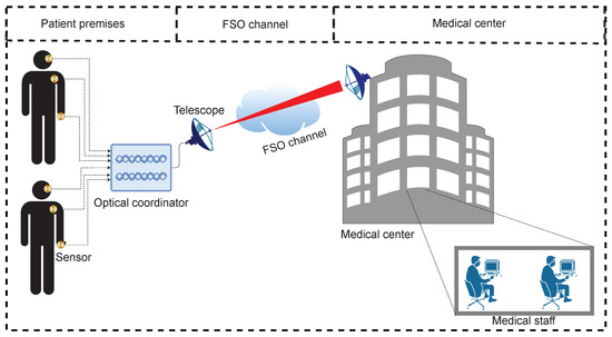 A point-to-point line-of-sight FSO link between the optical coordinator and medical center based on an intensity modulation–direct detection (IM-DD) scheme is considered in this work. The optical signal travels in a straight line through the FSO channel. The turbulent channel is considered as memoryless, stationary, and ergodic; therefore, the system can be modeled by the following equation: