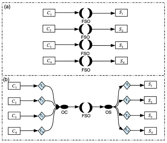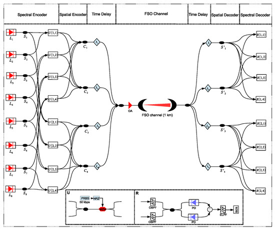 Figure 8a shows the block diagram of the conventional 2D-spectral/spatial FSO system, where each combiner and splitter pair represent a star coupler and relate to dedicated FSO links to avoid interference between repeated codes. Figure 8b shows the block diagram of the proposed architecture that employs time-delay units along with an optical combiner and optical splitter to replace multiple parallel FSO links with a single FSO path.