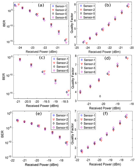 To show the effect of variation in the receiver telescope’s aperture diameter and beam divergence over the BER and Q-factor, the aperture diameter and beam divergence were gradually increased in order to observe their effects on the BER and Q-factor. Figure 6 shows plots of the BER and Q-factor versus the receiver aperture diameter for sensor 1 and sensor 5 obtained at = 21 dB/km; the values of C and the beam divergence are 5 × 10 m and 2 mrad, respectively.