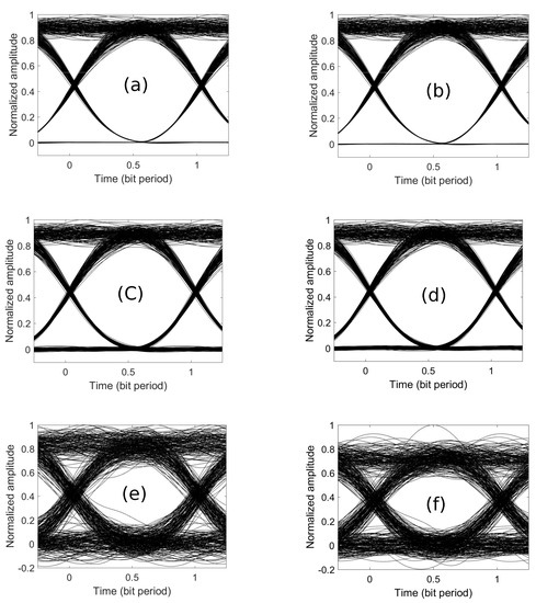 Normalized eye diagrams of sensors for different values of atmospheric attenuation. (a,b) Sensor-1 and sensor 5 at = 2 dB/km. (c,d) Sensor 1 and sensor 5 at = 11 dB/km. (e,f) Sensor 1 and sensor 5 at = 21 dB/km.
