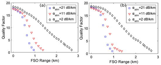 Q-factor versus FSO range plots for different values of atmospheric attenuation: (a) sensor 1 and (b) sensor 5. A value of the C parameter equal to 5 × 10 m was used.