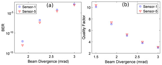 It is clearly evident that the BER decreases while the Q-factor increases on increasing the receiver aperture diameter. Similarly, Figure 7 shows plots of the BER and Q-factor versus the beam divergence for sensor 1 and sensor 5 obtained at = 21 dB/km; the values of C and the receiver aperture diameter were 5 × 10 m and 20 cm, respectively.